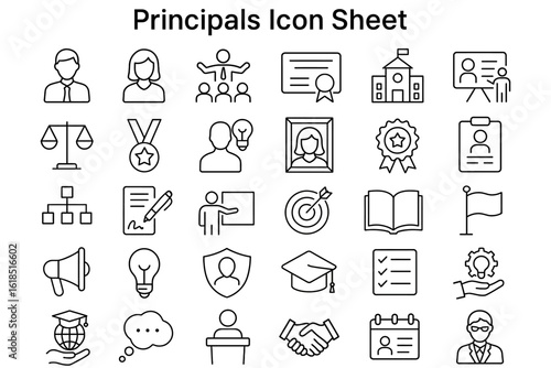 Principals Icon Sheet: A collection of simple line icons, representing various concepts related to principals, showcasing education, leadership, and authority in a clean, modern design.