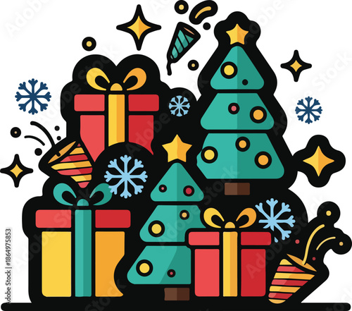 celebration, festive, christmas, winter, present, tree, gift, snowflake, fireworks, holiday, december, season, joy, warmth, cheer, party, ornament, decoration, star, blue, red, yellow, green, seasonal, flat, cartoon, illustration, vector, bright, fun, modern, simple, cheerful, happy, delightful