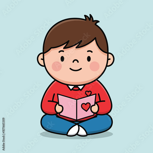 boy, cartoon, children, smiling, happy, children, young, person, male, brown, hair, cute, illustration, animated, character, red, shirt, sitting, leg, crossed, book, reading, pink, nubes, valentine