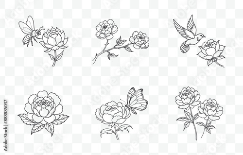 Print Peony Line Art Vector Set Elegant Floral Illustrations for Design and Decoration Projects