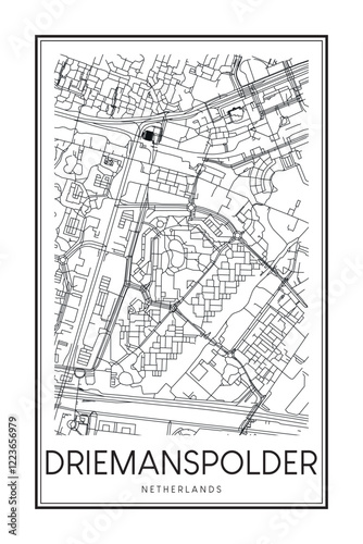Printable downtown road map poster of the Dutch city of DRIEMANSPOLDER on solid white background with city name