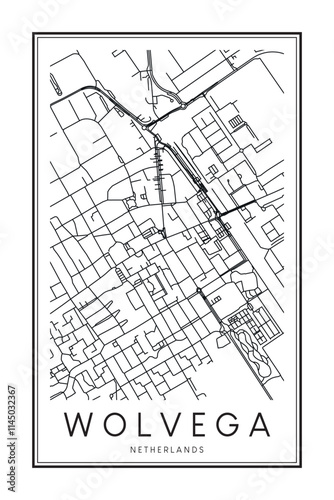 Printable downtown road map poster of the Dutch city of WOLVEGA on solid white background with city name