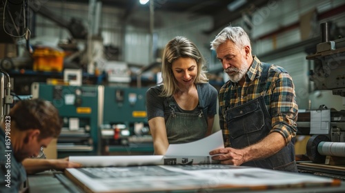 printing, workshop, proof, professional, examine, team, older, man, woman, younger, tied-up, factory, industrial, production, manufacturing, paper, graphic, design, collaboration, work, project, quality, control, review, discussion, sharpened, concentration, focused, serious, industry, machinery, equipment, process, print, layout, colours, image, ink, machine, detail