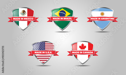 PrintVector glossy shields with country flags indicating country of manufacture. with banner over the shield that has `Made in country name` on it. U.S.A., Mexico, Brazil, Argentina, Canada.