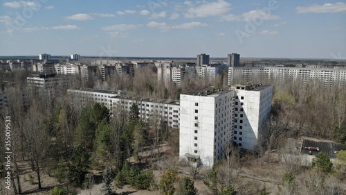 Pripyat aerial panorama cityview. . Drone flies over the deserted abandoned city of Pripyat, Ukraine. Exclusion zone near the Chernobyl nuclear power plant.
