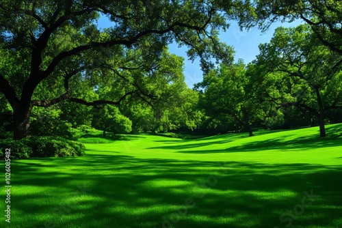 Pristine Golf Course Fairway, Lush Green Grass, Majestic Trees, Bright Blue Sky, Serene Outdoor Landscape