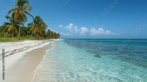 Pristine tropical beach scene. Tranquil white sand shore meets turquoise ocean under a vibrant blue sky, fringed by swaying palm trees