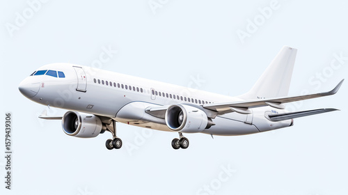 Pristine white passenger airplane soars in the blue sky, a modern airliner showcasing sleek design and powerful engines, ready for air travel.