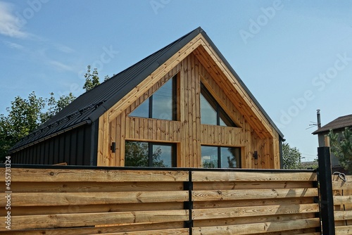 private brown wooden house with large windows behind a wall of fence made of planks on the street
