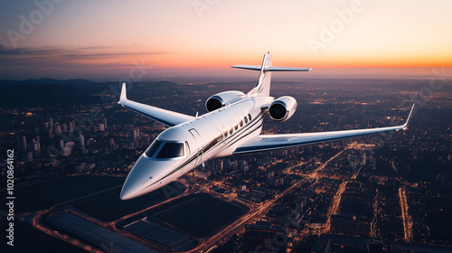 Private jet flying over a cityscape during sunset with illuminated buildings and streets below, showcasing luxury travel and aviation.