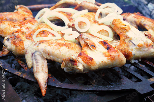 process of preparing marinated chicken wings on the grill, chopped onion rings, copy spase