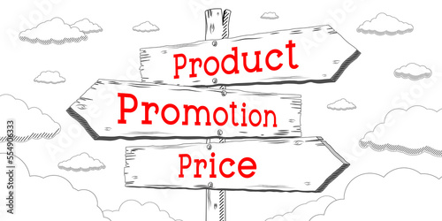 product, promotion, price, marketing, advertising, signpost, crossroad, guidepost, signs, three, arrow, direction, cloud, pointer, sky, outline, cartoon, wooden, text, word, concept, white, drawing, vignetting, white background, red, illustration