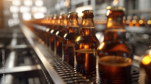Production line of amber beer bottles on industrial conveyor belt. Professional brewery manufacturing process with backlit glass containers creating warm glow effect