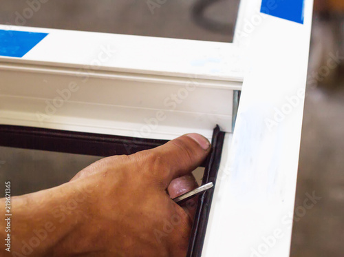 Production of pvc windows, the worker installs the sealing rubber in the pvc frame, close-up, hands