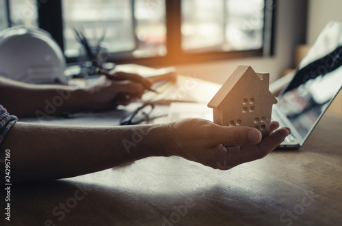 professional architect, engineer or interior reviewing blueprint with laptop computer and holding house model at home office, construction, engineering, industry, contractor and business concept