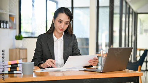 Professional Asian businesswoman focusing on her task on paperwork, working at her desk
