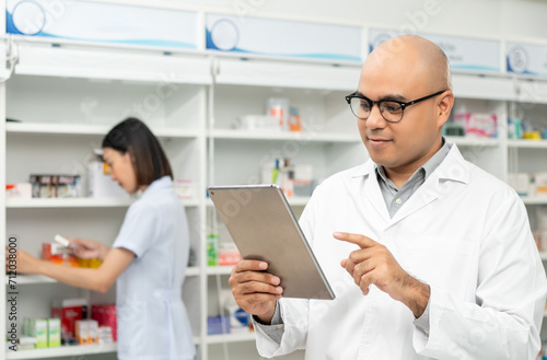 Professional asian man pharmacist checks inventory arrangement of medicine in pharmacy drugstore. Male Pharmacist wearing uniform standing near drugs shelves counter prescription to customers