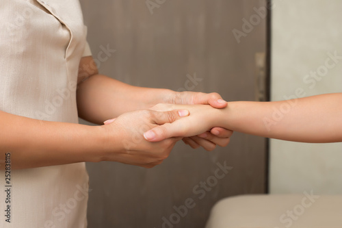 Professional Asian Therapist twist and massage spa on hand of customer to release stress relax muscle pain or injury. Physiotherapist pressing hard fingers thumb on specific spots of female palm hands