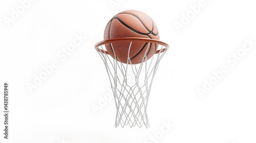 Professional basketball falling into the net on isolated hoop backdrop for sport concept