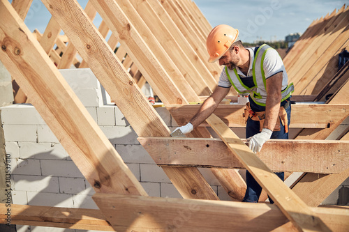 Professional builder in protective equipment building a roof