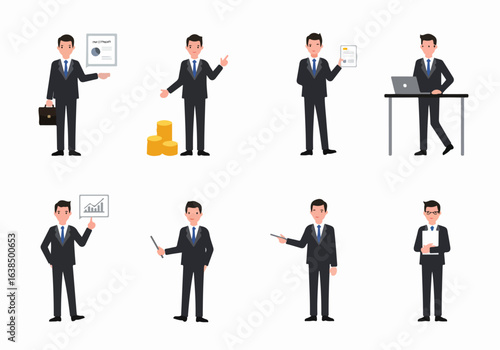 Professional Businessman Cartoon Character Set: Finance, Presentation, and Office Work Illustrations for Business Concepts and Financial Success