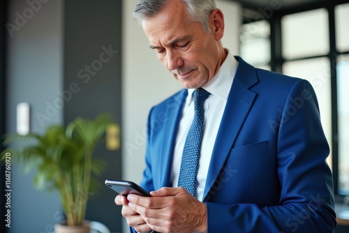 Professional Businessman in Blue Suit Using Smartphone in Modern Office Setting, Ideal for Business Marketing and Corporate Branding