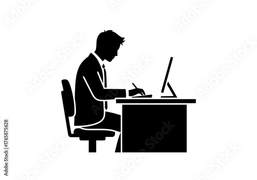 professional, silhouette, man, computer, vector, businessman, office, work, male, desk, working, document, job, corporate, executive, employee, occupation, business, productivity, concentration, sharpened, study, men at work, manager, administration, task, project, report, technology, career, person, human, sitting, graphic, illustration, half face, profile, entrepreneur, student, education, learning, success, growth, finance, analysis, development