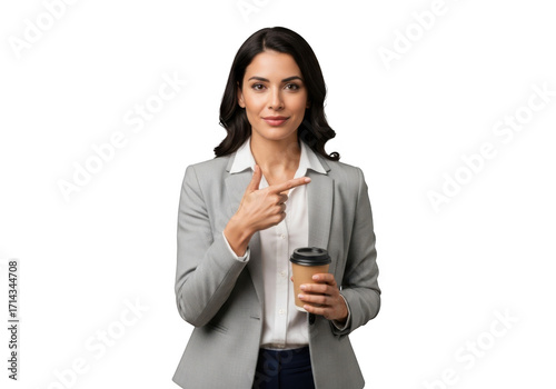 businesswoman, professional, woman, hot drink, cup, pointing, sideway, stock, photo, presentation, marketing, material, corporate, office, suit, leader, executive, manager, job, career, success, confident, female, adult, brunette, isolated, transparent, background, person, lady, portrait, gesture, drink, paper, this