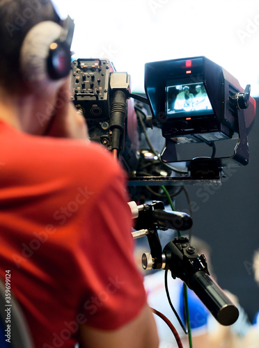 Professional cameraman with headphones with HD camcorder in live television