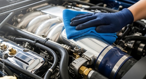 engine, car, automotive, cleaning, detailing, maintenance, hand, glove, blue, clothes, vehicle, shiny, metal, chrome, mechanical, part, component, bay, service, polishing, wiping, care, auto, garage, workshop, technician, professional, spotless, routine, inspection, performance, mechanic, industrial, protective, precision, expertise, quality, power, engineering, motor, transportation, closeup, work