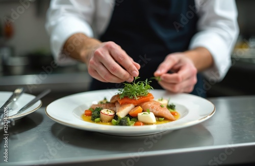 Professional chef garnishes gourmet dish with microgreens in restaurant kitchen. Focus on hands, garnish, plate with meal. Delicious healthy cuisine preparation by cook for dinner.