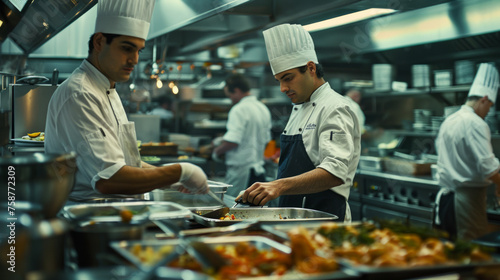 Professional chefs are seen in a bustling kitchen environment, preparing dishes with focus and expertise