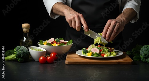 chef, cook, hand, man, salad, food, meal, dish, pork meat, meat, lettuce, broccoli, tomatoes, corn, spinach, vegetable, olive oil, dressing, ingredient, preparing, cooking, plating, serving, chopping, slicing, cutting, arranging, creating, kitchen, eatery, studio, dark, background, black, countertop, slate, chopping board, epicure, culinary, professional, skill, precision, expertise, healthy, fresh, organic, diet, nourishment, lifestyle