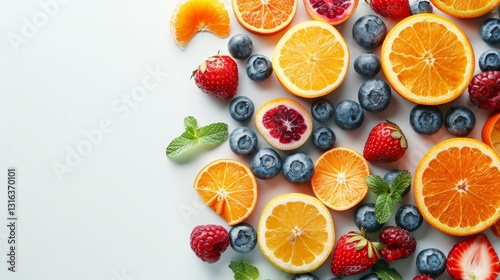 Professional close up look of healthy fresh fruits with lots of white space in background