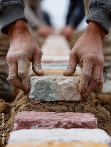 Professional Community Garden Volunteers Laying Stone Pathway Authentic Teamwork and Infrastructure Improvement for Modern Landscaping Marketing