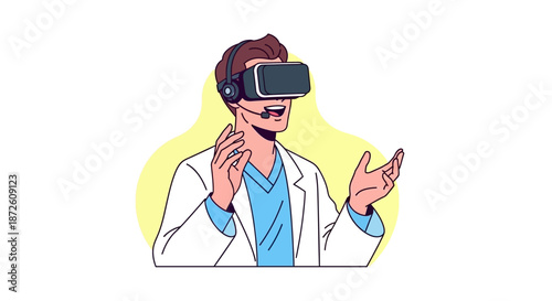 doctor, health care, simulation, professional, innovation, technology, surgeon, education, e-learning, scientist, instructor, labcoat, modern, futuristic, illustration, line art, vector, character, man, teaching, presentation, communication, high technology, diagnostic, research, development, specialist, seminar, workshop, interactive, experiment, headset, microphone