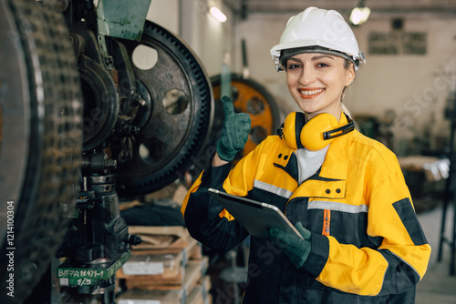professional engineer caucasian women inspecting auditing old machine in heavy industry factory