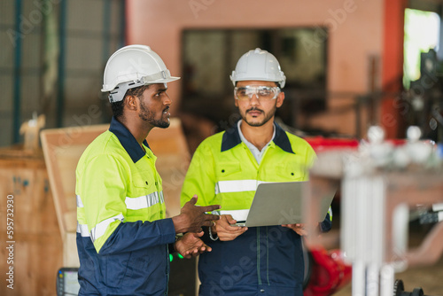 Professional engineer holding robot controller checking and repairing automatic robotic machine at industrial factory, Technician worker working with robotic arm system for manufacturing production