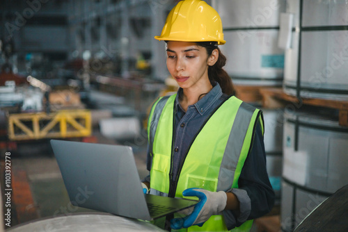 Professional female engineer, worker, technician, using laptop to inspect metal production, industry, black woman wearing hard hat, inspecting quality of machinery and steel.