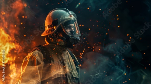 Professional Firefighter in Uniform and Oxygen Mask Standing Amid Fire Sparks and Smoke Against Dark Background. Courage and Heroism in Firefighting