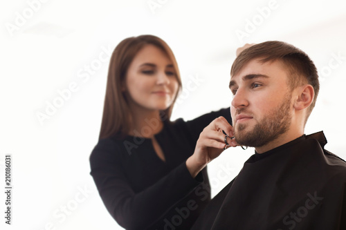 Professional hairdresser working with client in salon