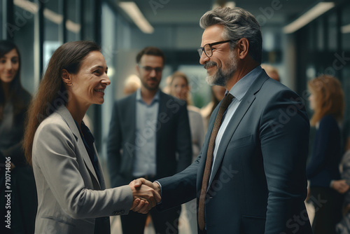 handshake, smiling, office, team, professional, man, woman, corporate, agreements, female executive, teamwork, greeting, partnership, corporate culture, leadership, colleague, success, attire, negotiation, cooperation, management, strategy, meeting, networking, deal, oneness, businesswoman, businessman, consensus, group
