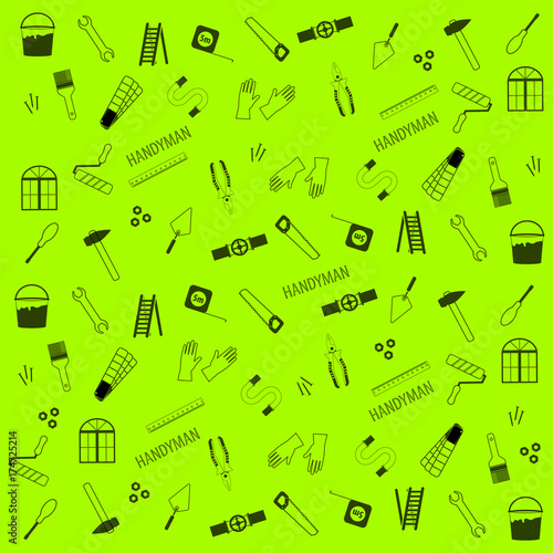 Professional handyman services. Pattern of tools for repair in green. Stock vector. Flat design.