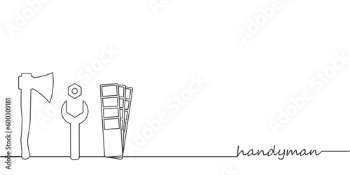 Professional handyman services. Vector banner template with axe, wrench, color catalog silhouette and text space. Repair tools on white background for your web site design, app, UI. EPS10.