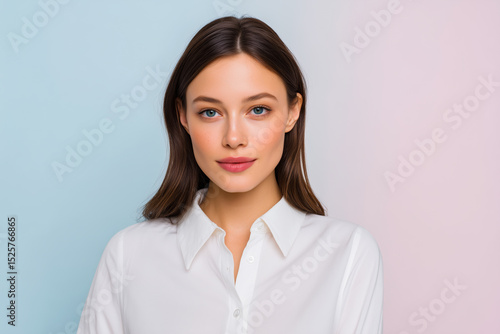 woman, portrait, head shot, face, young, person, beautiful, businesswoman, female, white shirt, natural makeup, beauty, caucasian, american, professional, looking, confident, smiling, natural, studio, isolated, corporate, business, hair, skin, elegant, friendly, skincare, casual attire, student, employee, blue eye, brunette, smile, model
