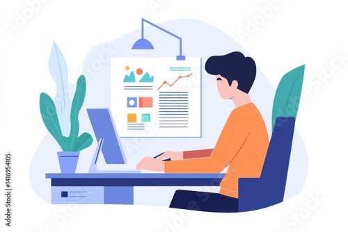 Professional in office working on report while analyzing data trends at a desk with plants in background
