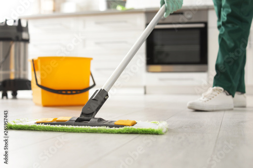 Professional janitor cleaning floor with mop in kitchen, closeup. Space for text