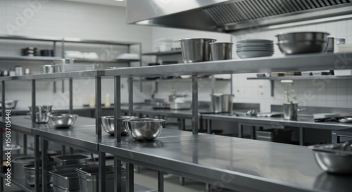 Professional Kitchen Interior with Stainless Steel Shelves and Equipment