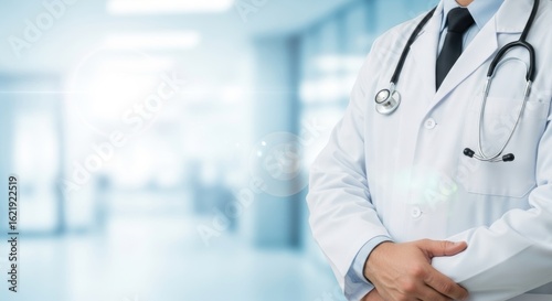 Professional male doctor in white coat with stethoscope in hospital corridor