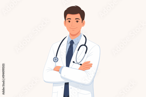 Professional Male Doctor Vector Illustration Wearing White Lab Coat and Stethoscope with Arms Crossed and a Friendly Smile, Healthcare Practitioner Character for Medical and Hospital Concepts.